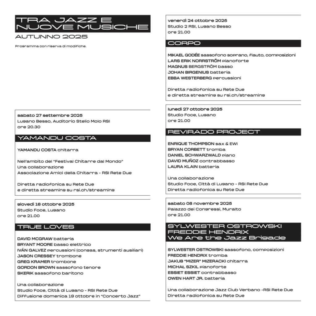 Maggiori informazioni sulla rassegna “Tra jazz e nuove musiche”: https://www.rsi.ch/rete-due/tra-jazz-e-nuove-musiche/